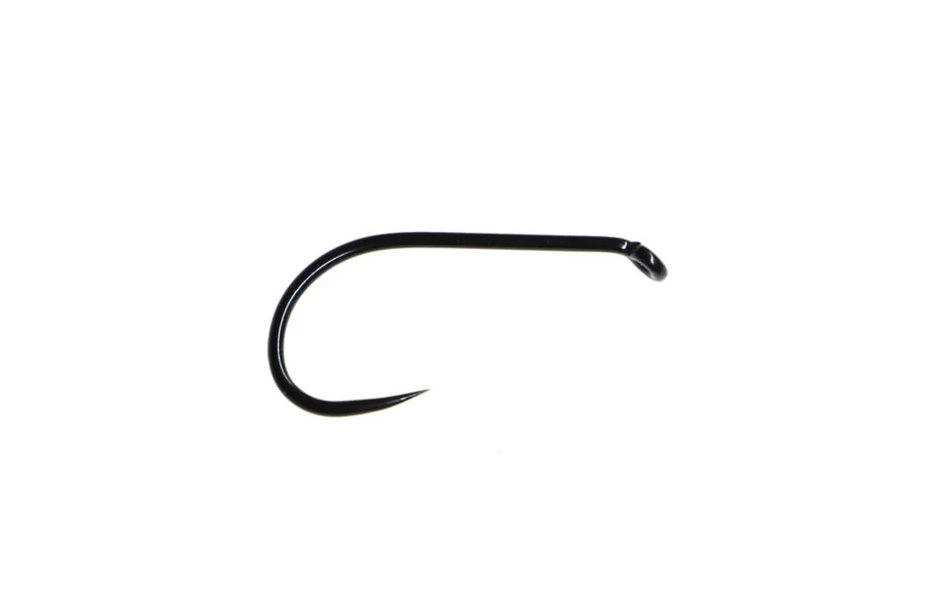 Dry fly, down eye, 1 extra wide, extra fine wire, barbless, black. The razor point and barbless design ensure quick penetration and a secure hold. A versatile design that can be incorporated into dries, soft hackle flies, CDC flies and emergers with ease.